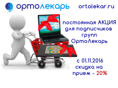 Для подписчиков групп ОртоЛекарь в соцсетях Фэйсбук, ВКонтакте, Одноклассники с 01 ноября 2016 года действует постоянная акция - скидка 20% на прием компьютерной подометрии в салоне ОртоЛекарь.